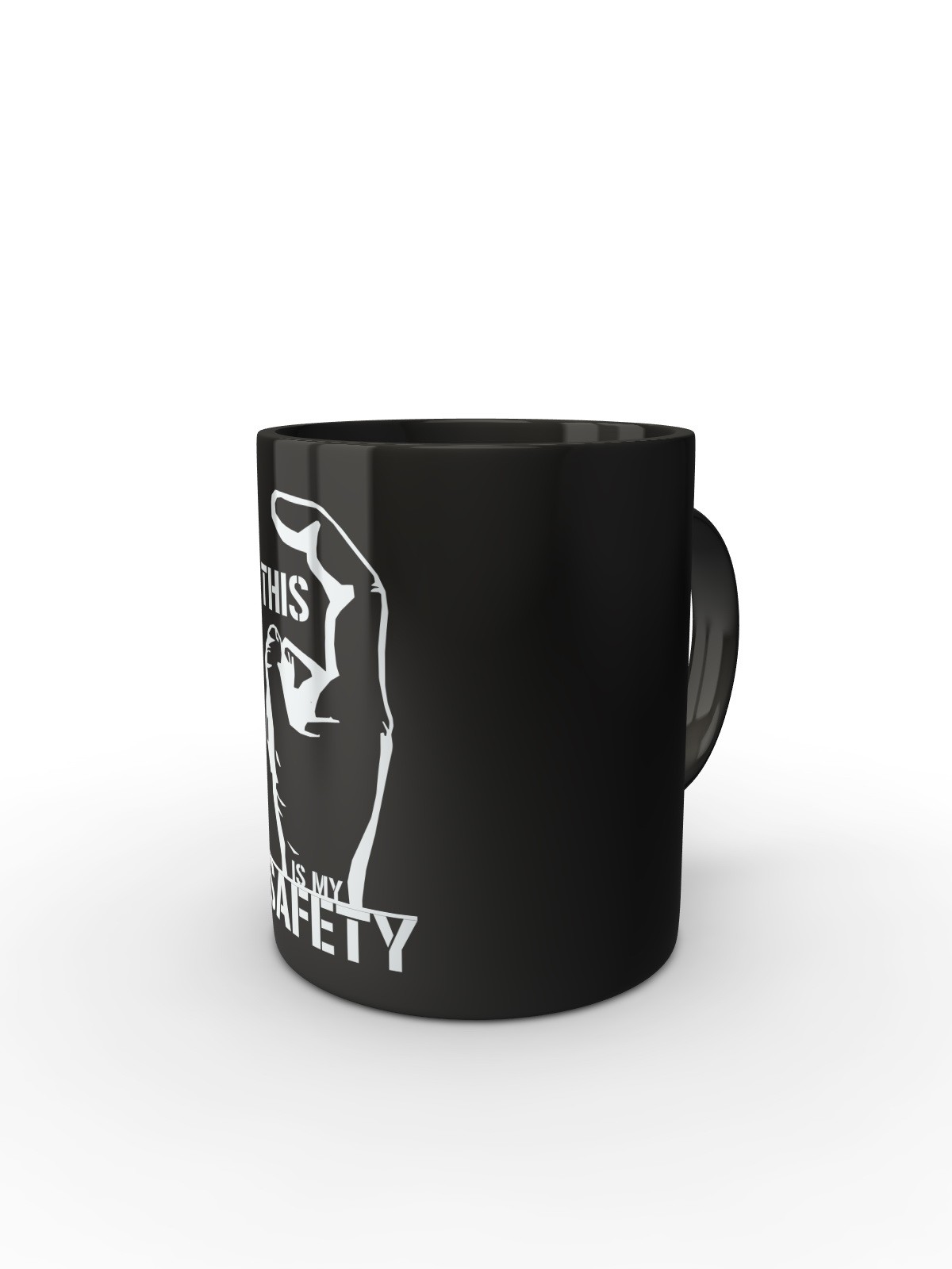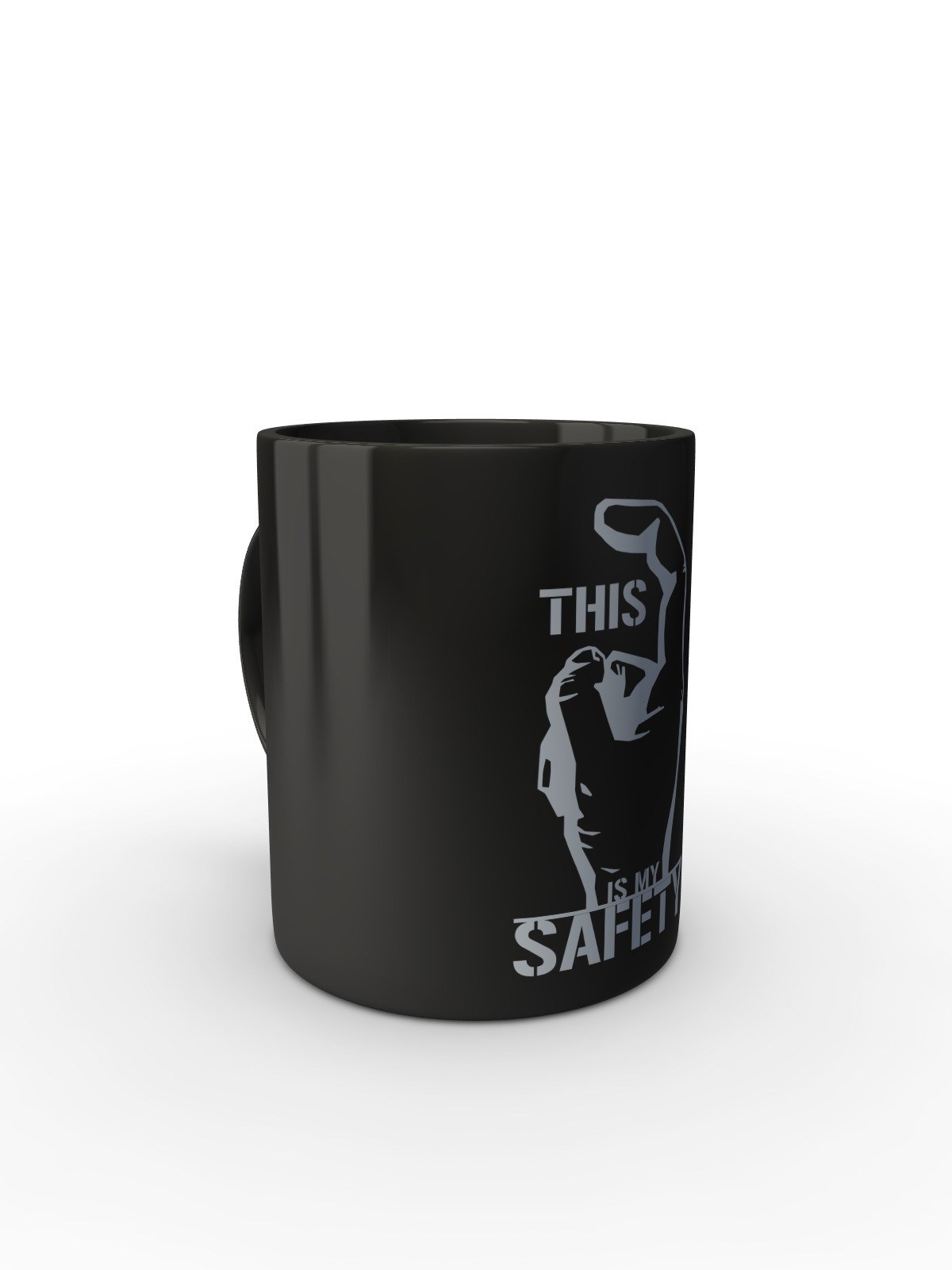 Černý hrnek s motivem inspirovaným filmem Black Hawk Down (toto je moje pojistka).