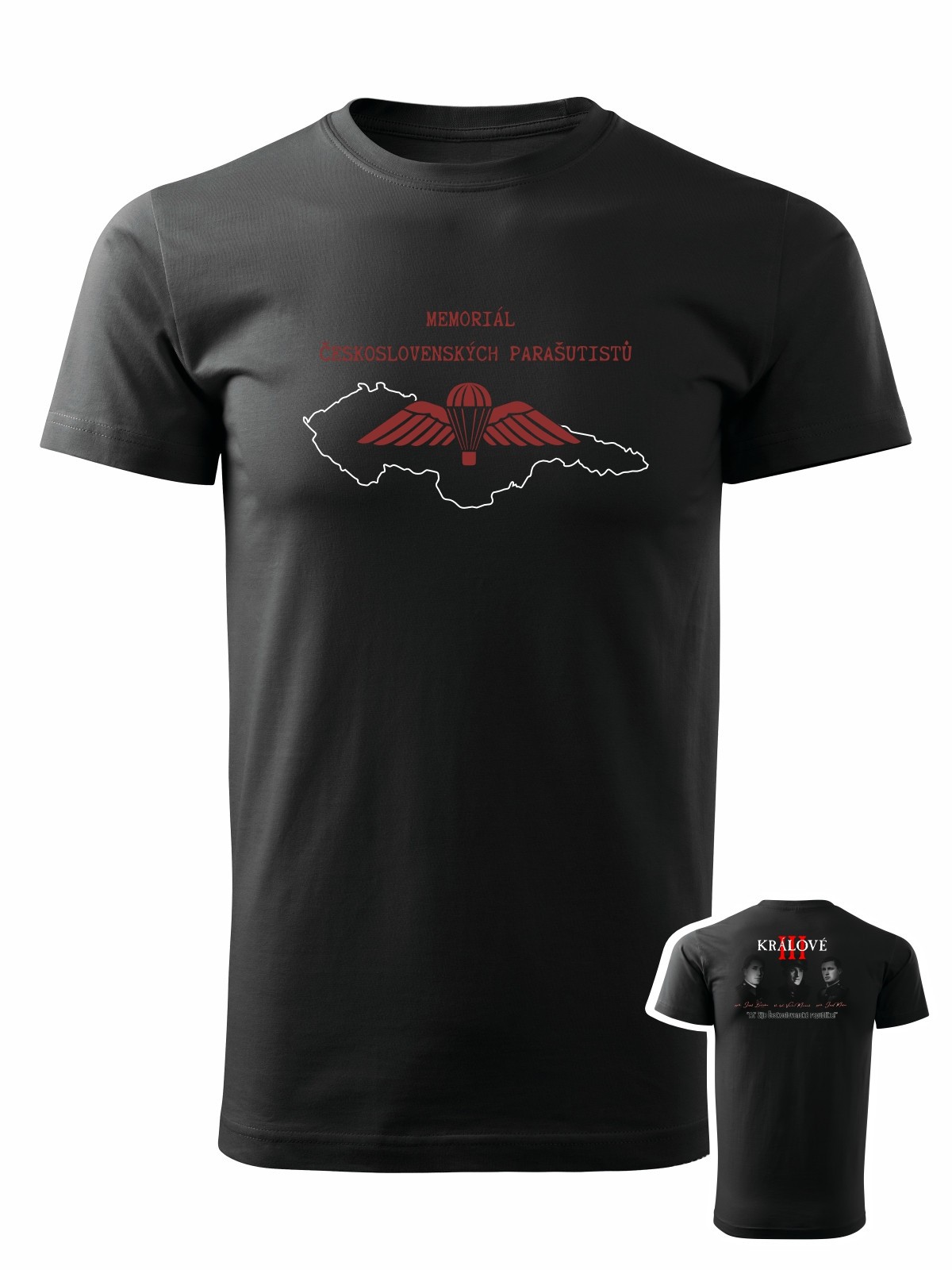Dámské bavlněné tričko s krátkým rukávem vydáno k akci Memoriál československých parašutistů 2025. Na přední straně trička je obrys mapy Československa, výsadkářská křídla a nápis "Memoriál československých parašutistů". Na zadní straně trička jsou fotografie výsadkářů z operace Anthropoid doplněné nápisem "Ať žije Československá republika". Toto tričko je vzdává hold hrdinství a odvaze československých parašutistů a jejich účasti na historických událostech. Jemná bavlna a pohodlný střih zajišťují pohodlí a styl při nošení na každodenních aktivitách. Buďte součástí historie s tímto jedinečným tričkem!