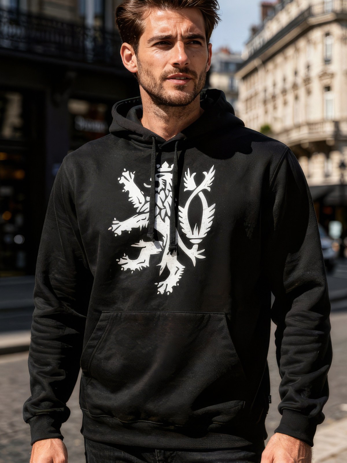 Pánska mikina s kapucí a Českým lvem na prsou.